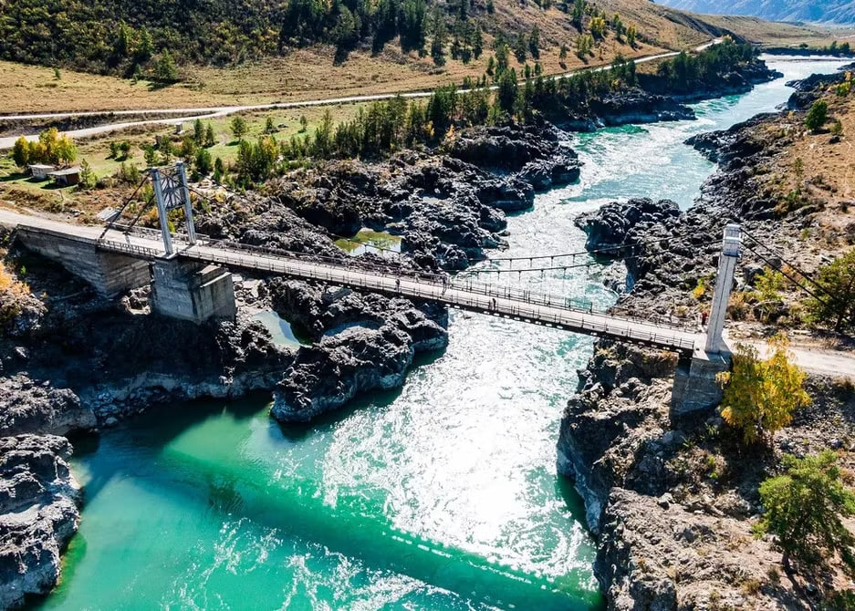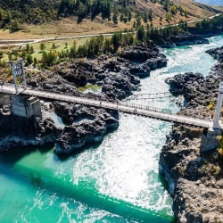 Ороктойский мост. Первая точка — стальной подвесной мост, висящий над самым глубоким местом Катуни (до 70 метров!). Мы прогуляемся по нему и полюбуемся скалистыми берегами из древней вулканической породы.