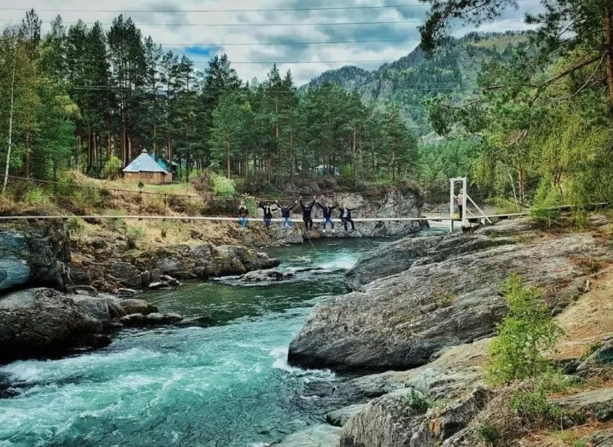 Далее нас ждёт прогулка по подвесному мосту над шумной Катунью к знаменитым скалам «Зубы Дракона». Эти острые каменные зубцы, торчащие из реки, — идеальное место для созерцания, медитации у воды или строительства своей каменной пирамидки на память.