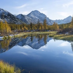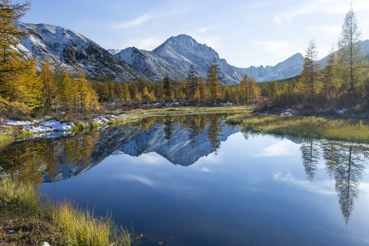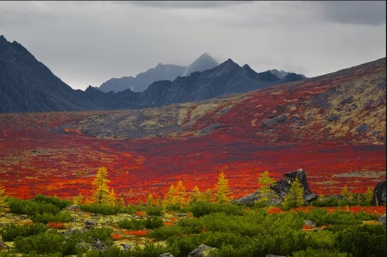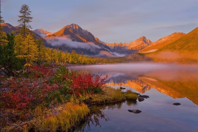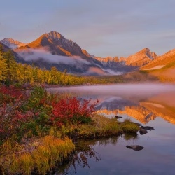 Осень на Колыме — отдельный бренд. Хребет Черского присыпает первым снегом, лиственницы вспыхивают жёлтым, тундра становится красной, а десятки озёр с названиями из книг Джека Лондона отражают всё это в зеркальной воде.