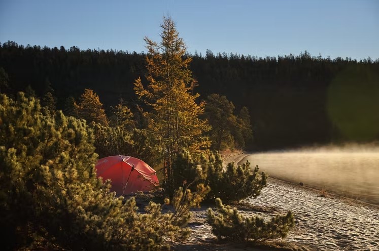 🔹 Лагерь – Коса на берегу озера. Лиственницы, ягодники.