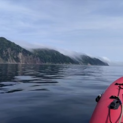 Старт от поселка Новиково, названного в честь крейсера «Новик», принявшего бой в 1904 году. Выходим в море на лодках ПВХ, проходим 35 км вдоль мысов Слюда и Мраморный. Цель — маяк Анива на скале Сивучей: сложнейший инженерный проект эпохи Карафуто. На обратном пути — высадка на мысе Мраморный. Скала здесь сложена мрамором с вкраплениями кварцитов, андезитов, опалов, халцедонов. По всей акватории высокая вероятность встретить касаток.