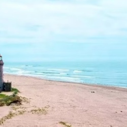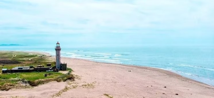 Вокруг — белоснежные песчаные дюны, похожие на декорации научно-фантастического кино. Дикий пляж, который называют Сахалинским Майами. В хорошую погоду можно купаться в водах Японского моря.