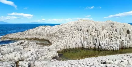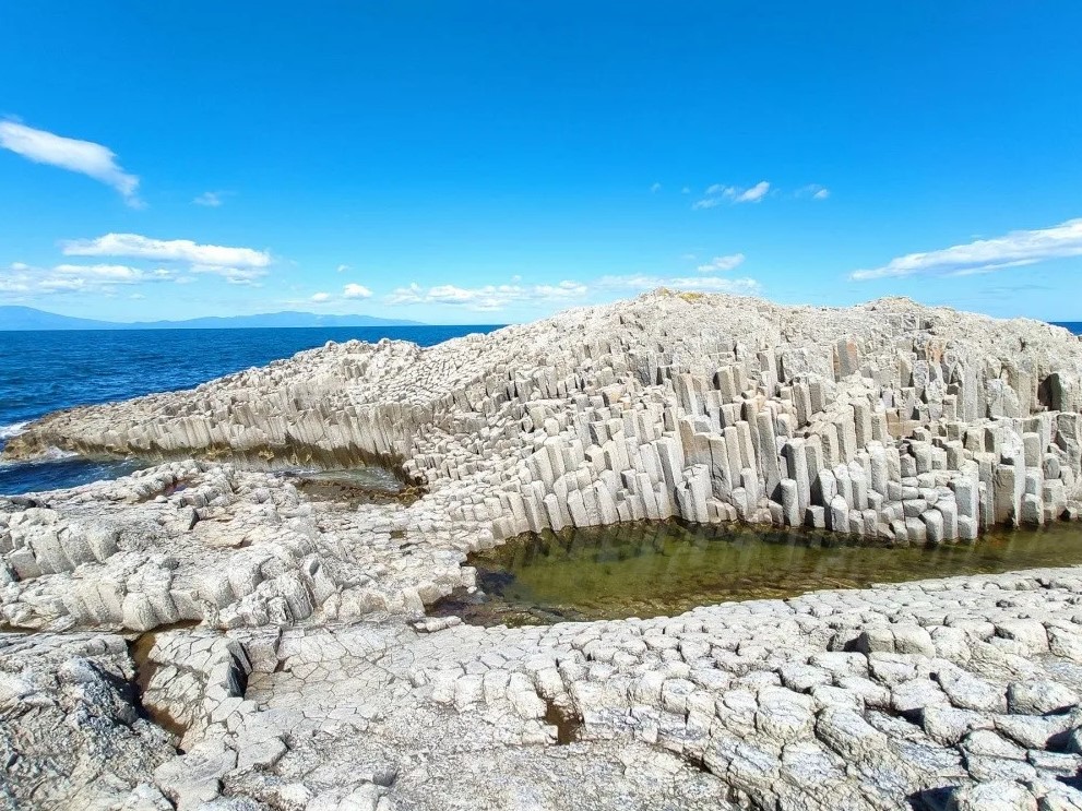 Вторая половина дня — мыс Столбчатый. Риолитовые колонны высотой до 50 метров, идеальные пяти- и шестигранники, созданные медленным застыванием лавы. Одни напоминают трубы органа, другие — мостовую или панцирь черепахи.