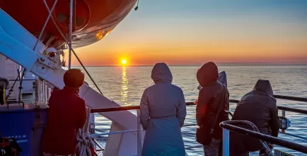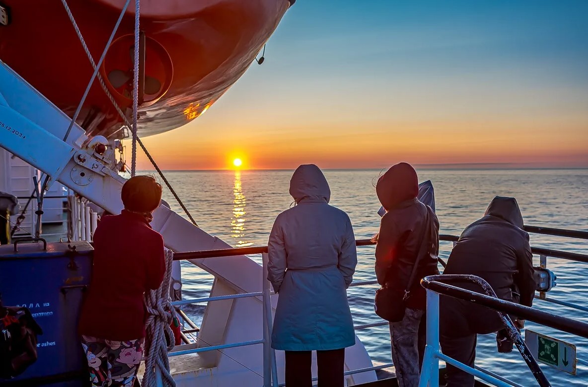 Утро на палубе — морской рассвет в персиковых и золотых тонах. После обеда — финальная встреча с маяком Анива. Он снова появляется на горизонте, замыкая маршрут. Всю дорогу высокая вероятность встретить дельфинов, косаток и китов.