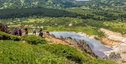 Прибытие, размещение в гостинице, выезд к вулкану Менделеева. Пеший путь через бамбучник — около 3 км, полтора часа. Цель — фумарольные поля с двумя самыми мощными фумаролами Курил: ярко-желтый налет, шум газа, ощущение инопланетного пейзажа. По пути — руины серного завода.