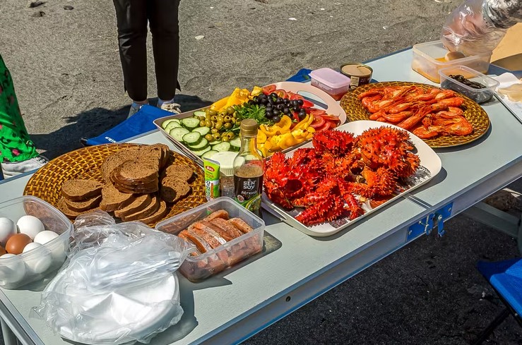 Обед с эксклюзивом: яйца, сваренные в термальном ручье, подаются с красной икрой, затем — полноценный прием пищи из свежих морепродуктов.