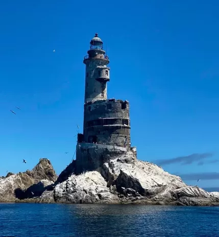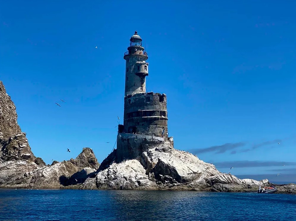 Выезд в село Новиково, посадка на катер. Морской переход 38 км (в обе стороны) к маяку Анива на скале Сивучей. Личное время для фото у памятника инженерной мысли эпохи Карафуто.