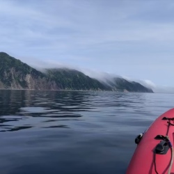 Старт от поселка Новиково, названного в честь крейсера, принявшего бой в 1904 году. Выходим в море на мореходных лодках ПВХ и проходим 35 км вдоль мысов Слюда и Мраморный. Главная цель — маяк Анива, инженерное чудо периода Карафуто на скале Сивучей. На обратном пути — высадка на мысе Мраморный: скала из мрамора с вкраплениями кварцитов, опалов, халцедонов. По всей акватории высокая вероятность встретить касаток.