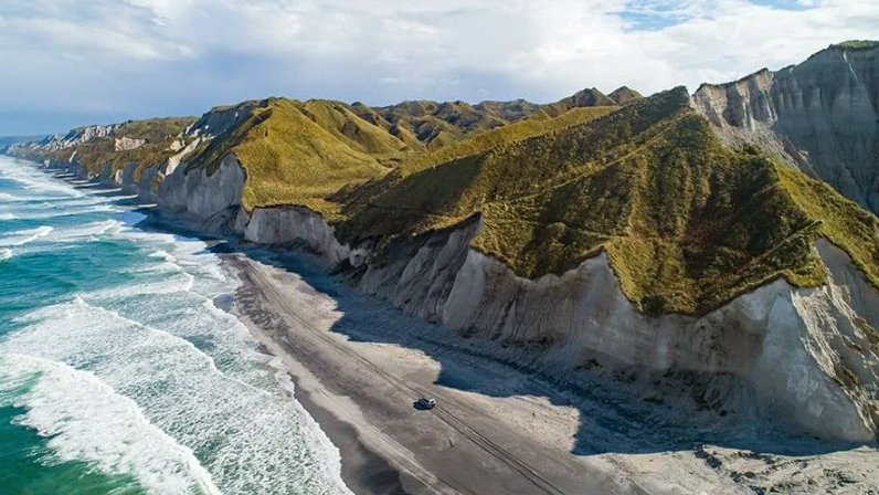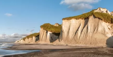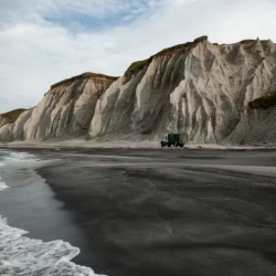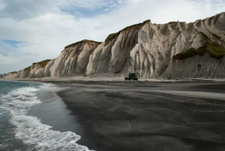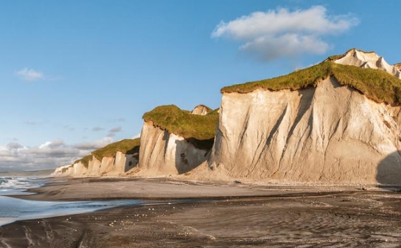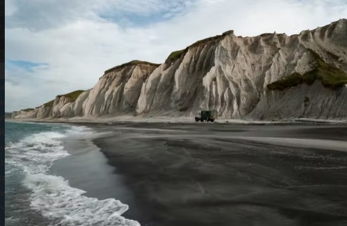 Побережье, которое чаще сравнивают с Исландией и Францией, чем с Россией. Едем прямо по белому песчаному пляжу вдоль 28-километровой гряды скал из пемзы и вулканического стекла. Их высота достигает 120 метров, а кварц в песке придает берегу удивительное сияние. Останавливаемся в самых живописных точках, а за скалами обнаруживаем черные дюны из застывшей лавы.