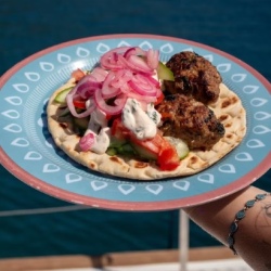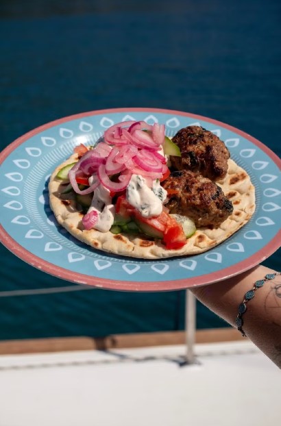 Неспешное утро в бухте Меганиси, завтрак на палубе.
