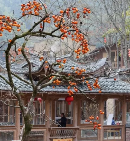 Осенью уезд Пиннань превращается в живую открытку: старинные дома, утрамбованные земляные стены, чёрная черепица крыш и яркие гирлянды спелой хурмы, свисающей прямо во дворы. Это путешествие про атмосферу — тёплый свет, сбор урожая, утренние туманы и неспешные прогулки среди вековых деревьев.