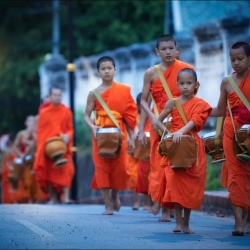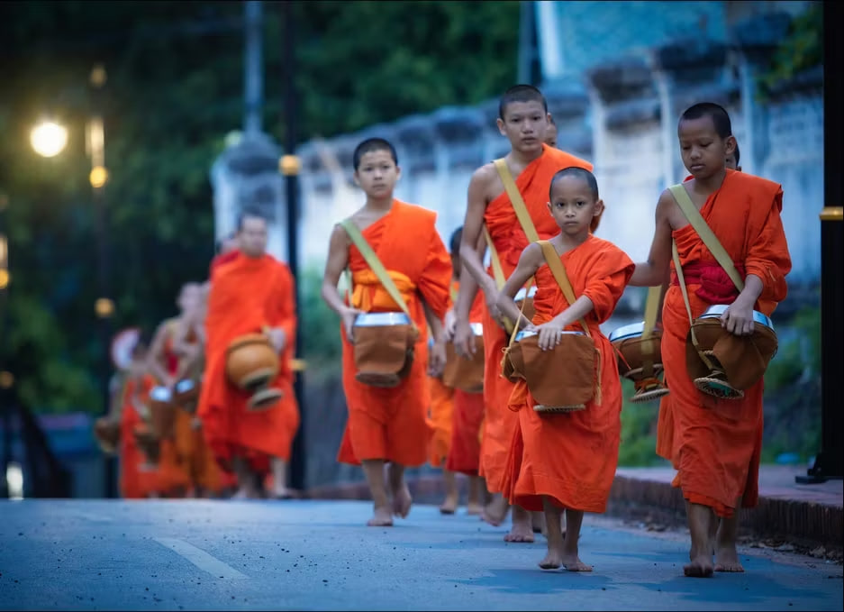 🙏 До завтрака: наблюдение за многовековой традицией Так Бат (Tak Bat) — шествием монахов в оранжевых облачениях по улицам Луанг Прабанга.