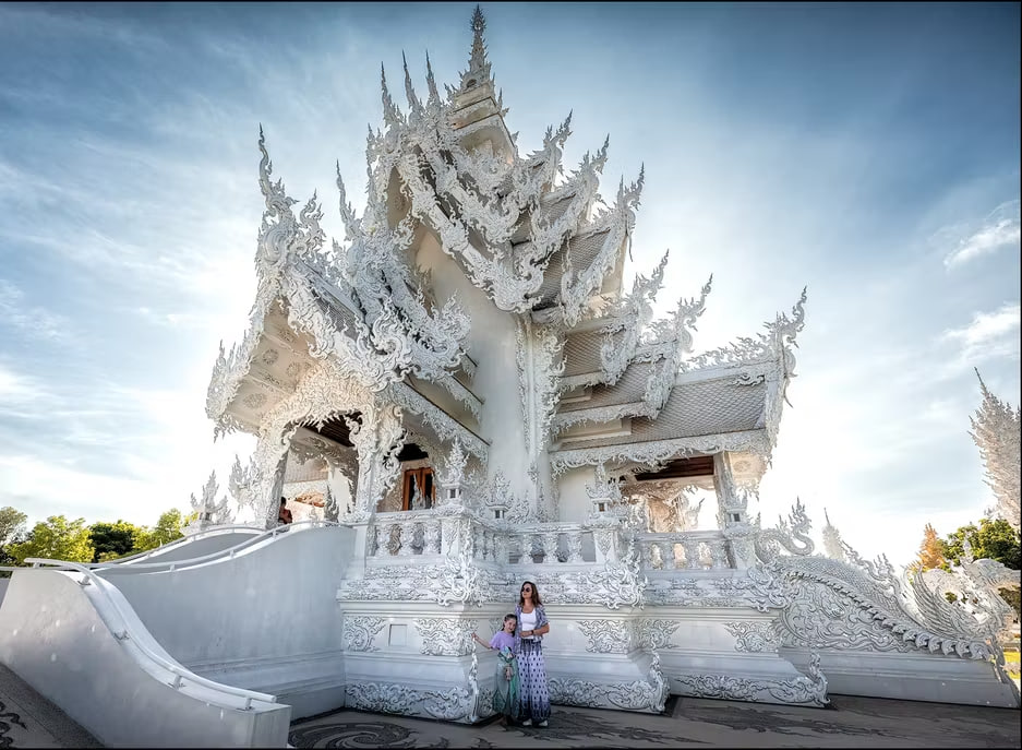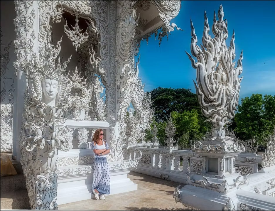 ⚪ Утро: посещение Белого храма (Ват Ронг Кхун) — жемчужины буддийской архитектуры. Бетонная основа, покрытая алебастром, инкрустация зеркальной мозаикой, глубокий символизм каждой детали.