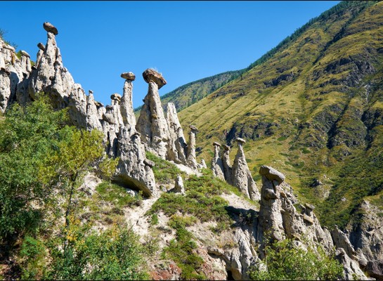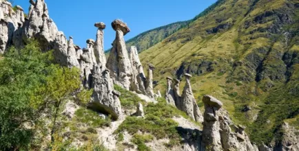 Далее нас ждёт прогулка по подвесному мосту над шумной Катунью к знаменитым скалам «Зубы Дракона». Эти острые каменные зубцы, торчащие из реки, — идеальное место для созерцания, медитации у воды или строительства своей каменной пирамидки на память.