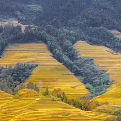 Утром на минивенах переезжаем в Пинган, где нас ждут невероятные рисовые поля. Рис — значимая часть китайской культуры: здесь до сих пор засевают поля вручную, стоя по колено в воде, без использования современных технологий. Террасные каскады выглядят как огромные чешуйчатые драконы. Весной поля залиты водой и отзеркаливают небо, а осенью отливают золотом — в это время можно увидеть, как собирают урожай.