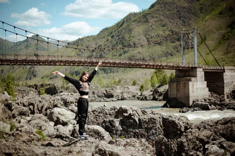 Далее маршрут приводит нас к Еландинской пещере — сквозной карстовой полости с арочным входом и панорамными видами на Катунь. Кульминация дня — Ороктойский мост, перекинутый над самым глубоким участком реки, где бурная Катунь сжимается между скалами из застывшей лавы.