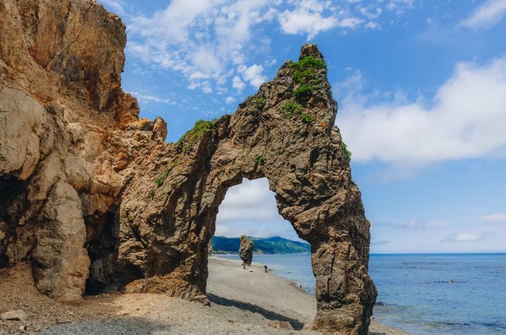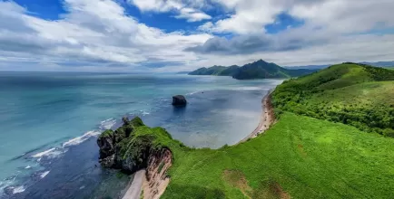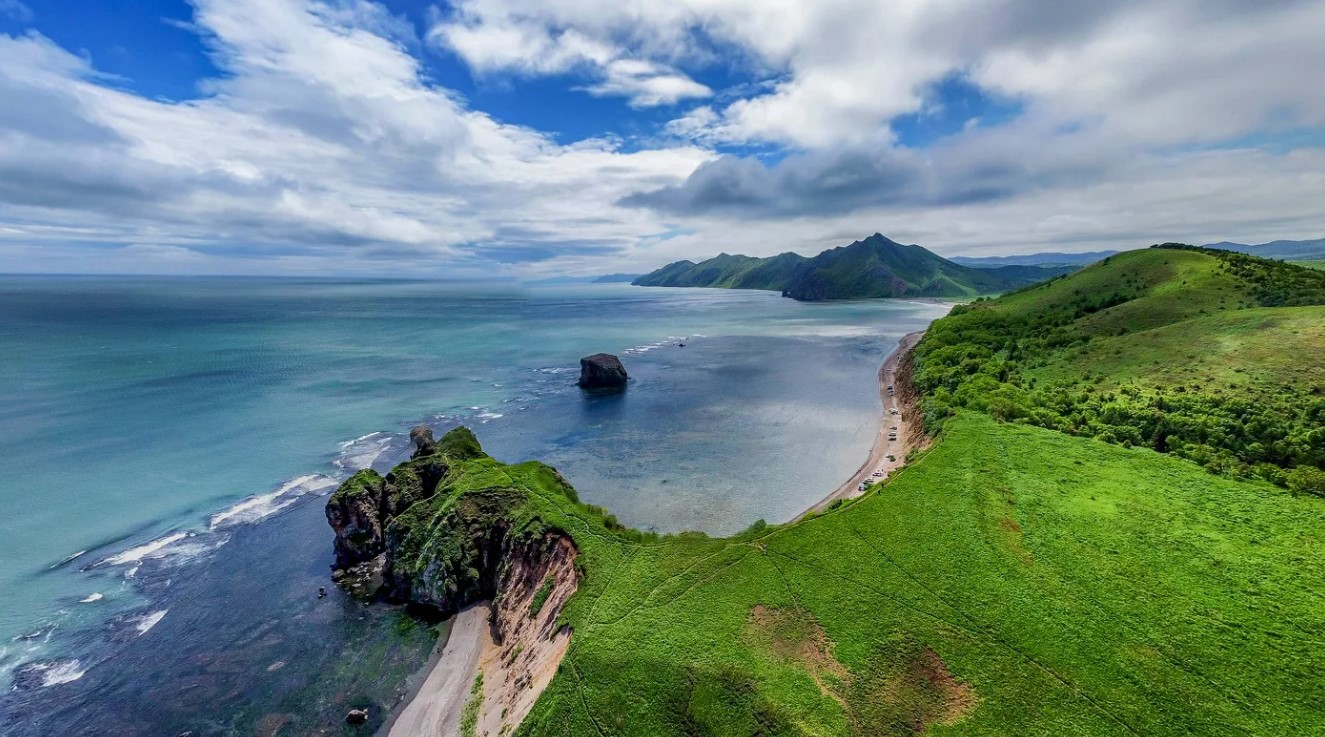 Выезд на юг, к двум знаковым мысам Корсаковского района. Сначала — мыс Птичий: панорамы озер, кекуры и ожившие птичьи базары на останцах. Затем — мыс Великан, визитная карточка острова. Причудливые скалы вдоль берега складываются в фигуры льва, замка или спящего богатыря. Гуляем 2–3 км, смотрим на арки, надводные камни и останцы. В августе–сентябре есть шанс увидеть ход лосося на нерест.
