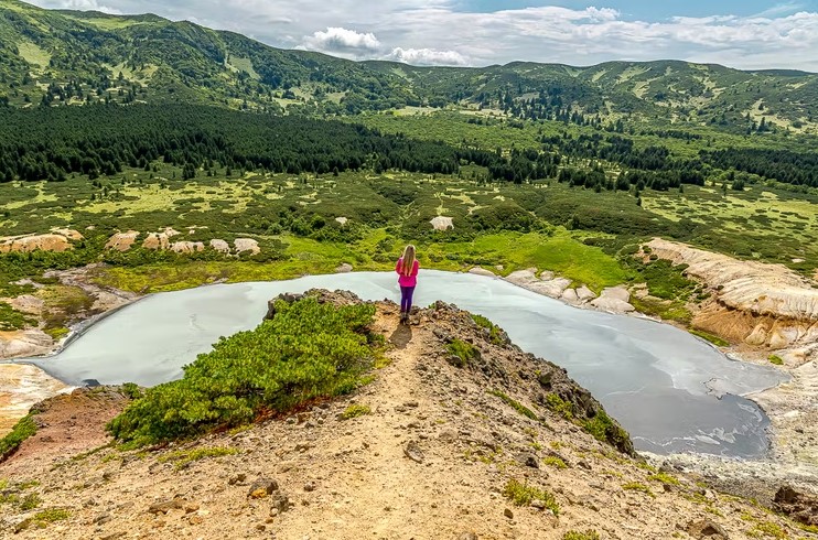 Сама кальдера — чаша диаметром 5 км, внутри — два минерализованных озера: Горячее и Кипящее. Фумаролы, пар, небольшие грязевые гейзеры. Вулкан живет.