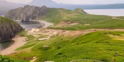 Выезд на юг острова к двум знаковым мысам. Сначала — мыс Птичий: панорамы озёр, скальные кекуры и ожившие птичьи базары. Затем — визитная карточка Сахалина, мыс Великан. Причудливые скалы вдоль берега складываются в фигуры спящего богатыря или льва, выходящего из моря. Гуляем 2–3 км, смотрим на арки, останцы и надводные камни. В августе–сентябре есть шанс увидеть ход лосося.