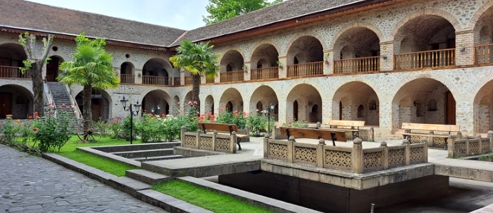 Переезд в Шеки (80 км). Дворец Шекинских ханов — уникальная постройка без единого гвоздя, витражные окна шебеке из венецианского стекла. Гончарная мастерская: секреты создания витражей. Крупнейший в Закавказье караван-сарай XVII века и тайна люстры папы римского. Дегустация пахлавы в доме сладостей, подарки для близких. Знакомство с кялагаи и шелководством Азербайджана. Возвращение в Баку с видами на колоритные пейзажи.