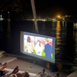 Вечером — ужин на борту: мясо на гриле, вино, просмотр фильма под открытым небом и звезды.
