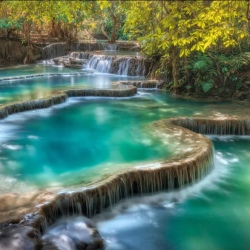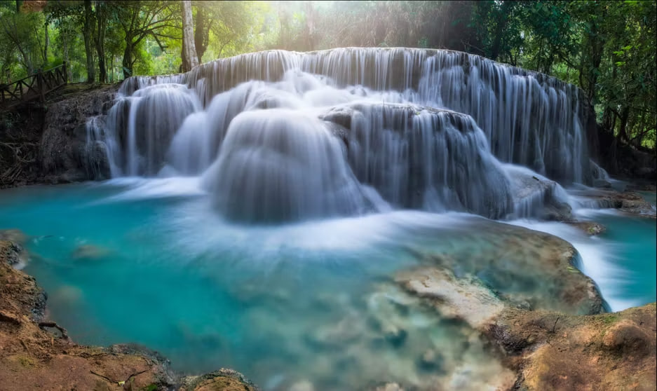 💦 Утро: посещение водопада Куанг Си (Kuang Si) на территории национального парка. Высота главного каскада — 54 метра. Подъём по тропе через джунгли, купание в бирюзовых бассейнах между каскадами.
